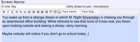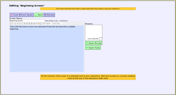 Here, in the "Editing Screen".... screen, you'll see several options. At the top is a notification that this is the beginning of your adventure; obviously, this will only be visible when that's the case. The row of buttons that follows allows you to Save, Preview, or Close the Editing window; if this screen weren't the first one in the Adventure, we would also be able to Delete it from here.